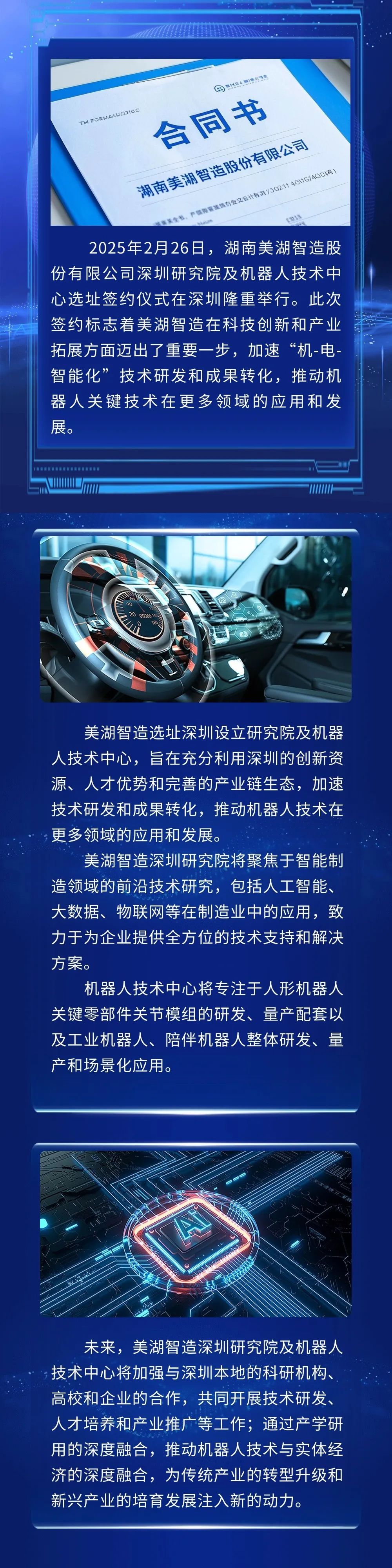 美湖智造深圳研究院及機(jī)器人技術(shù)中心正式選址簽約 助力機(jī)器人產(chǎn)業(yè)升級 ? 文章來源: ??????作者:admin ?????? 發(fā)布時間: 2025/3/20?瀏覽次數(shù):
